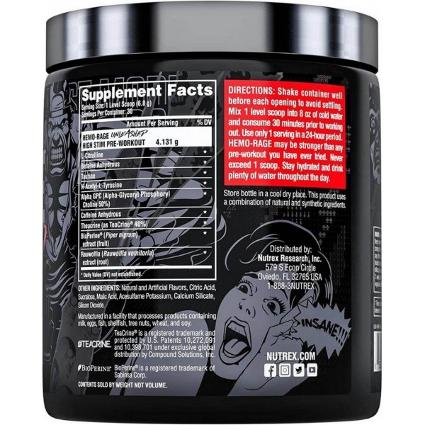 Передтренувальний комплекс поєднує близько 56 інгредієнтів (креатин, аргінін, вітаміни і мінерали, BCAA і т.д.), які здатні зробити ваші тренування більш ефективними, потужними і результативними. Він є відмінним донатором окису азоту, що забезпечує збільшення сили, наповнення кров'ю тканин м'язів, жироспалюючий ефект, підвищення імунітету і не тільки. Завдяки прийому Nutrex Hemo Rage ваш новий тренувальний процес стане незрівнянним із попереднім. Мотивація буде вищою, а вся увага зосередиться лише на виконанні тренінгу. Незабаром розкриється той потенціал, який був прихований у вашому тілі.