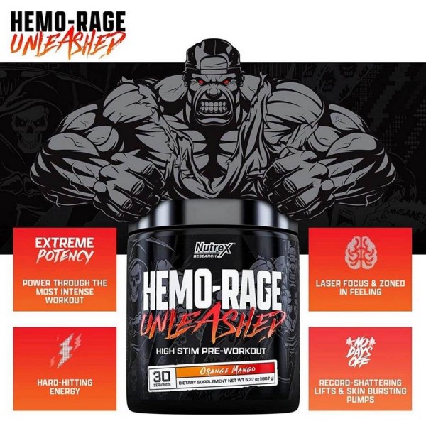 Передтренувальний комплекс поєднує близько 56 інгредієнтів (креатин, аргінін, вітаміни і мінерали, BCAA і т.д.), які здатні зробити ваші тренування більш ефективними, потужними і результативними. Він є відмінним донатором окису азоту, що забезпечує збільшення сили, наповнення кров'ю тканин м'язів, жироспалюючий ефект, підвищення імунітету і не тільки. Завдяки прийому Nutrex Hemo Rage ваш новий тренувальний процес стане незрівнянним із попереднім. Мотивація буде вищою, а вся увага зосередиться лише на виконанні тренінгу. Незабаром розкриється той потенціал, який був прихований у вашому тілі.