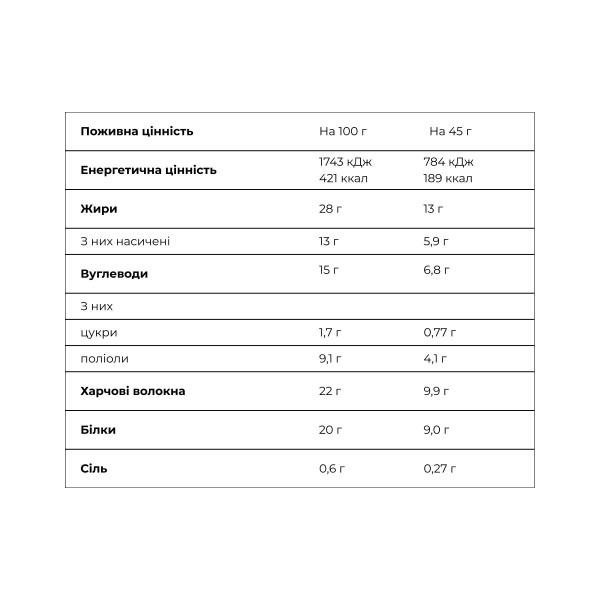Склад: арахіс 28%, молочний шоколад 16% (масло какао, харчові волокна – полідекстроза, сироватка молочна суха, підсолоджувачі (мальтит, стевіол глікозиди зі стевії), молоко сухе знежирене, какао-порошок, емульгатор – соєвий лецитин, натуральний ванільний ароматизатор), суміш білків (концентрат сироваткового білку [молоко], концентрат молочного білку), карамель з підсолоджувачами 13,5% (харчові волокна – ізомальтоолігосахарид, підсолоджувачі (сорбіт, мальтит), вологоутримуючий агент – гліцерин, молоко сухе знежирене, кокосова олія, емульгатор – моно- та дигліцериди жирних кислот, натуральний ароматизатор, сіль), харчові волокна – ізомальтоолігосахарид, кокосова олія, вологоутримуючі агенти (гліцерин, сорбітол), натуральний ароматизатор, емульгатор – моно- та дигліцериди жирних кислот, антиоксиданти - вітамін E (токоферол), регулятор кислотності – лимонна кислота. Може містити сліди яєць.