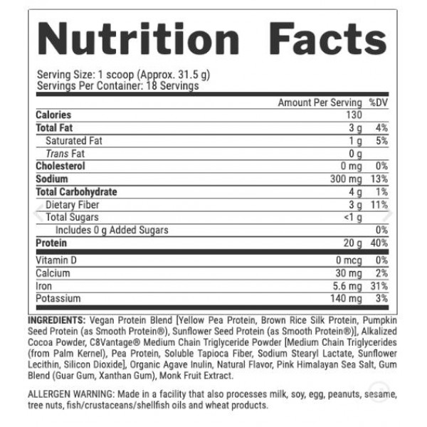 Він складається з 4 різних джерел рослинного білка для створення ПОВНОГО БІЛКОВОГО ПРОФІЛЮ, що складається з 20 амінокислот і всіх 9 незамінних амінокислот.