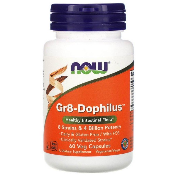 Gr8-Dophilus від NOW - це суміш 8 різних видів корисних бактерій, розроблена для підтримки здоров'я шлунково-кишкового тракту і роботи імунної системи. До складу також входять фруктоолігосахаріди, що сприяють здоровому росту ацідо- і біфідобактерій. Завдяки кишковорозчинній оболонці, Gr8-Дофілус від NOW доставляє мікрофлору безпосередньо в кишечник, успішно минаючи жорстку кислотну середу шлунка.