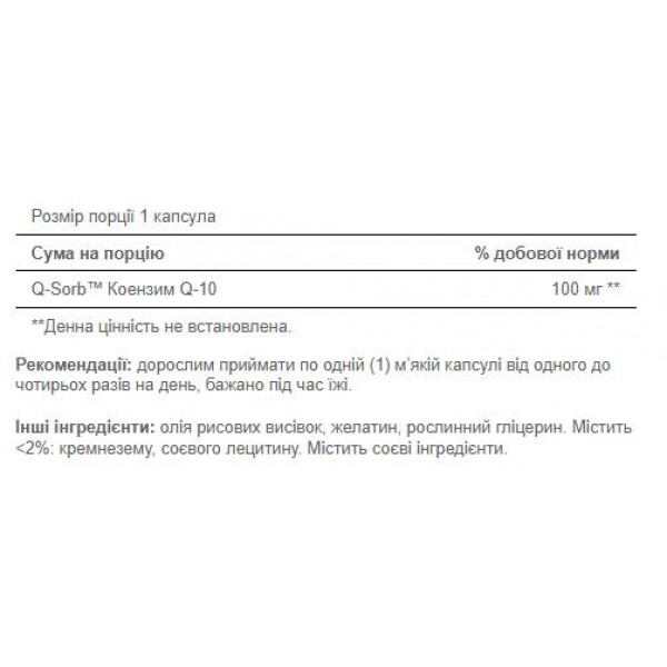 - Вміст Q-SORB™ Co Q-10: 100 мг на капсулу.