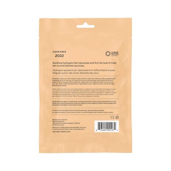 Обережно відкрийте упаковку стороною лотка з патчами догори на пласкій поверхні, щоб зволожувальний еліксир залишився в лотку. Вийміть патчі по черзі й накладайте на область під очима, лежачи на спині. Не кладіть маску безпосередньо в очі або на них. Зробіть селфі — вам це личить! Залиште на 15–20 хвилин. Зніміть і викиньте патчі.