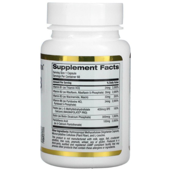 California Gold Nutrition B-Комплекссодержит слдующее сочетание основных витаминов группы В: Тиамин(B1), рибофлавин (B2), никотиновая кислота (B3), витамин (B6), фолат (B9), биотин (B7) и пантотеновая кислота (B5).