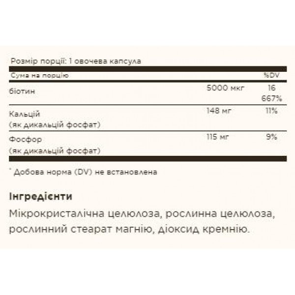 - Содержит 5000 мкг биотина в одной капсуле