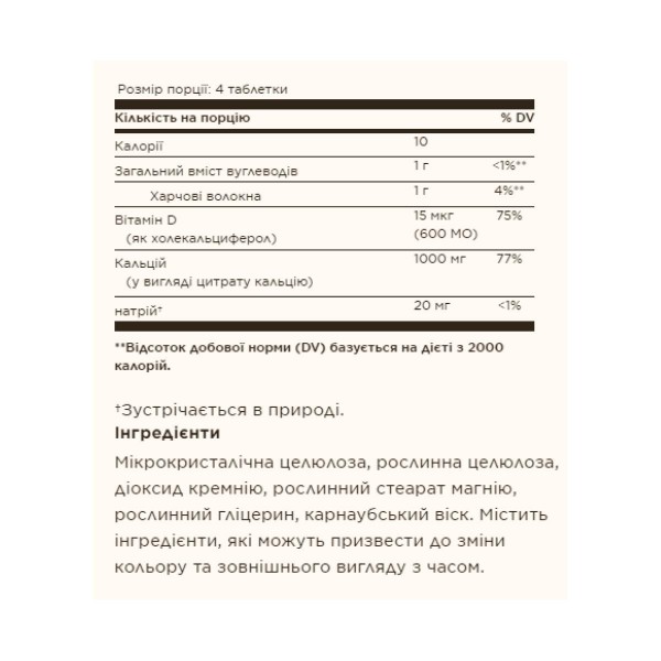 Кальций – это важный микроэлемент, необходимый ежедневно для хорошего здоровья. 99% кальция в организме содержится в костях и зубах. Этот микроэлемент является строительным материалом, помогающим поддерживать прочность и здоровье костей и зубов. Кроме того, кальций помогает поддерживать здоровье других систем организма, в частности, костно-мышечной и нервной систем. Это средство содержит витамин D3, способствующий усвоению кальция.
