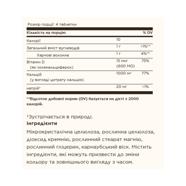 Кальций является важнейшим минералом, необходимым ежедневно для здоровья. 99% кальция в организме можно обнаружить в костях и зубах. Этот минерал является строительным материалом, помогающим поддерживать прочность и здоровье костей и зубов. Кроме того, кальций помогает поддерживать здоровье других систем организма, включая костно-мышечную и нервную систему. Этот препарат содержит витамин D3, способствующий усвоению кальция.