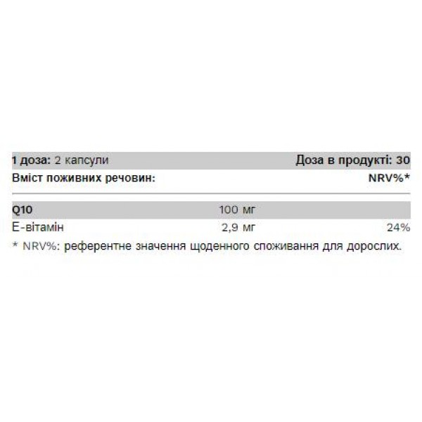 Формула капсульной диетической добавки Q10 из 100 мг Q10 и 2,9 мг витамина Е на порцию.
