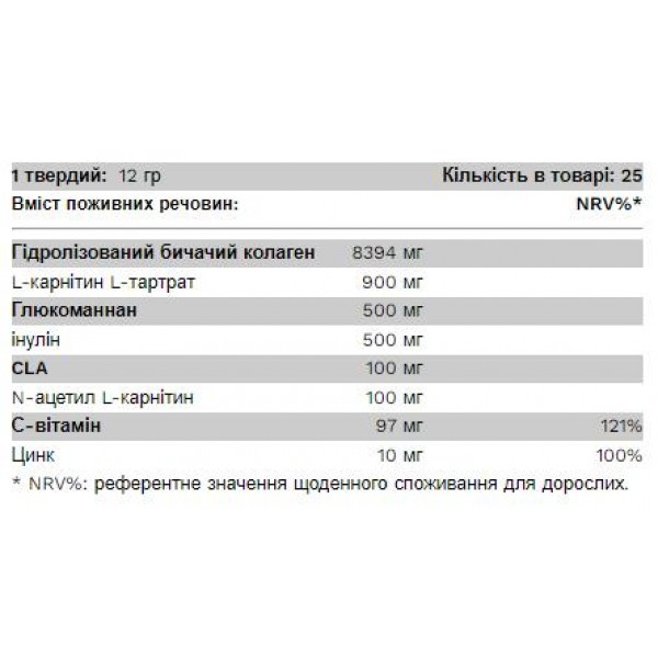Ингредиенты: гидролизованный говяжий коллаген, L-карнитин, L-tartrate, регулятор кислотности (лимонная кислота), глюкоза, инулин, аромат, краситель (красный из свеклу .). ), L-аскорбиновая кислота, хлорид натрия, оксид цинка.