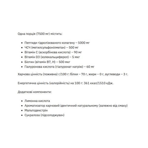 Коллаген является основным структурным белком, который естественно синтезируется в организме и состоит преимущественно из трех аминокислот: пролина, глицина и гидроксипролина. Добавление содержит гидролизованный коллаген Peptan® P 2000 LD, полученный из кожи свиней. Именно из свиной кожи чаще всего извлекают коллаген для пищевых добавок благодаря ее особой структуре и свойствам. Коллаген эффективно способствует омоложению кожи, ее упругости и поддержанию эластичности как можно дольше. Этот белок увеличивает гидратацию кожи от 21 до 50%. Кроме того, он увеличивает крепкость ногтей, подвижность и гибкость суставов.