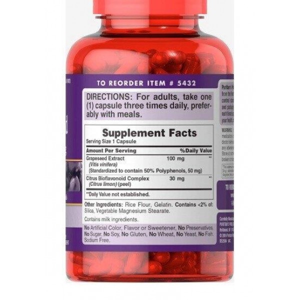 Экстракт виноградных косточек содержит олигомерные проантоцианидины (OPCs), которые являются природными биофлавоноидами. Стандартизирован на содержание 50% полифенолов. Взрослым можно принимать по одной капсуле три раза в день.