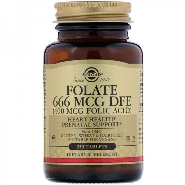 Folate от Solgar — это добавка с фолиевой кислотой (витамин B9) в легкоусвояемой форме. Фолат играет важную роль в делении клеток, синтезе ДНК, регуляции уровня гомоцистеина и особенно важен во время беременности.