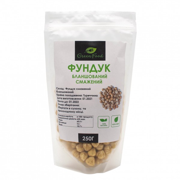 - Состав продукта:Фундук жареный очищенный бланшированный