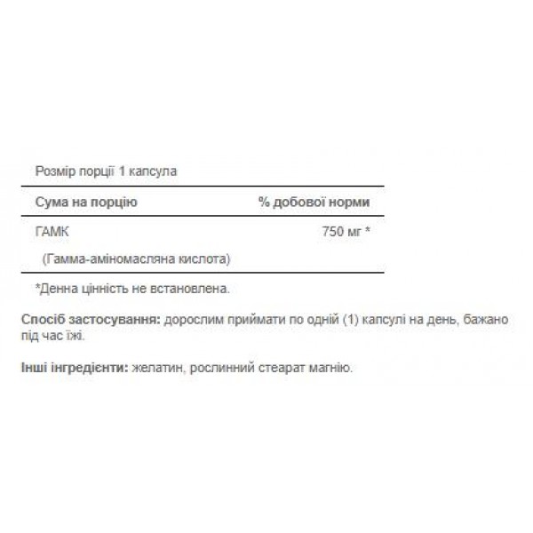 Обратите внимание, что ГАМК гамма-аминомасляная кислота, GABA 750mg - 90caps не является лекарственным средством. Не заменяет полноценное питание. Не превышайте рекомендуемую суточную дозу. Используйте согласно инструкции изготовителя, которая находится на упаковке или внутри нее.