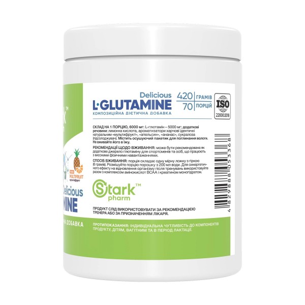 Пищевая добавка Stark Pharm – Stark Glutamine Delicious содержит условно незаменимую аминокислоту глютамин, употребление которой поддерживает здоровье кишечника, способствует укреплению иммунитета, улучшает работу мозга, а также является незаменимым помощником в восстановлении мышц после нагрузок. Кроме того, глютамин способствует общей антиоксидантной защите организма. Аминокислота глютамина служит источником энергии для клеток, ее участие в синтезе белков и поддержании азотистого баланса помогает предотвращать разрушение мышц.