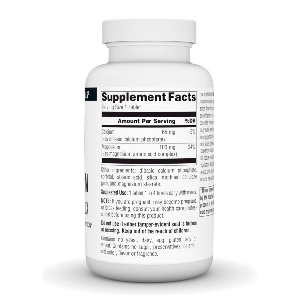 Комплекс Source Naturals с хелатом магния состоит из комплекса магния с аминокислотами гидролизованного растительного белка для облегчения усвоения и использования. Магний является важным минералом, который играет ключевую роль в более чем 300 ферментативных реакций обмена веществ. Он участвует в производстве и хранении энергии, расщеплении жирных кислот, синтезе белка, метаболизме ДНК, как произвольном, так и самопроизвольном расслаблении мышечной ткани, активности нейротрансмиттеров и регуляции гормонов. Магний сохраняется в основном в костях и наряду с другими минералами играет роль в метаболизме костей.