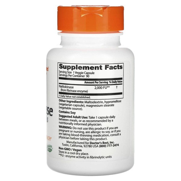 Наттокиназа - это фермент, извлеченный из "натто", популярного японского соевого продукта. Наттокиназа получается путем добавления бактерий брожения Bacillus subtilis в отварную негенномодифицированную сою в процессе приготовления натто. БАД "Наттокиназа Doctor's Best" содержит ферменты наттокиназы, из которых был удален витамин К2. По данным исследований наттокиназа понижает уровень фибриногена в плазме и поддерживает здоровый уровень системы кровообращения.