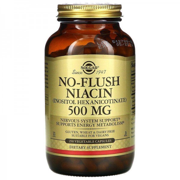 Ниацин, No-Flush Niacin, Solgar, не вызывающий покраснений, 500 мг, 250 вегетарианских капсул