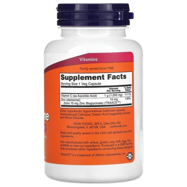 Now Foods, C-1000 с цинком для укрепления иммунитета, витамин C, 1000 мг и цинк, 15 мг, 90 вегетарианских капсул