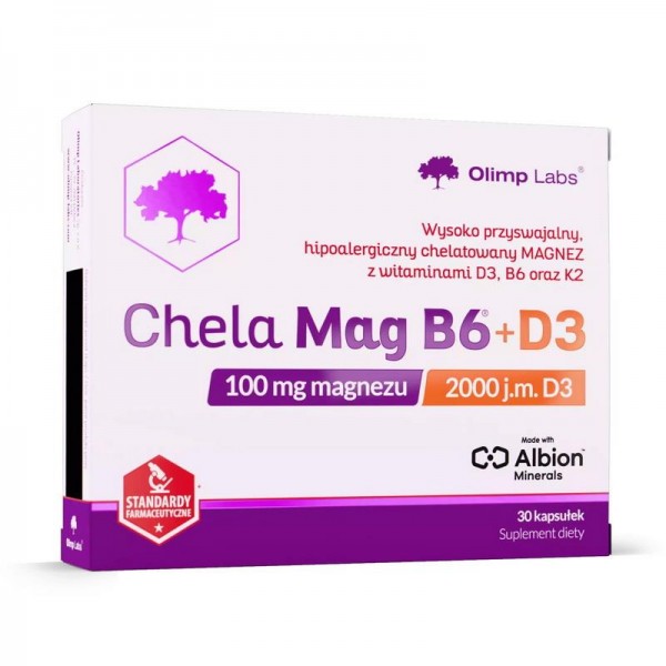Olimp Chela-Mag B6 + D3 представляет собой комбинацию магния в форме легко усваиваемой формы хелата Альбион и высокой дозы витамина D3. Эта уникальная комбинация этих двух компонентов является результатом последних научных исследований. Количество магния, которое мы употребляем в пищу, слишком мало для поддержания оптимального уровня витамина D в организме. Присутствие магния является фактором, необходимым для правильного хода процессов биосинтеза в активной форме витамина D. Исследования показывают, что присутствие магния необходимо для поддержания нужного количества витамина D.