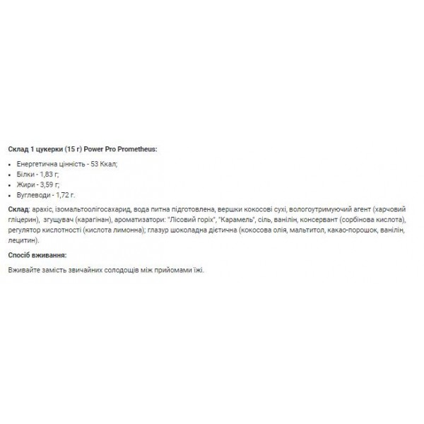 PROMETHEUS — идеальный перекус благодаря своим суперпитательный свойствам и яркому вкусу! Вкус глазури в сочетании с хрустящим арахисом, поднимет настроение тем, кто отказался от сладкого. ВКУСНО! БЕЗ САХАРА! НИЗКОКАЛОРИЙНО! СЫТНО! Арахис очень питателен. Он содержит целый набор полезных веществ: Витамины А, Д, Е. Группу витаминов В. Аминокислоты. Растительные жиры. В арахисе очень много антиоксидантов, которые защищают клетки организма от преждевременного старения и появления злокачественных образований, а также фолиевой кислоты и биотин, которые активируют обменные процессы в организме и нормализует гормональный фон. Арахис укрепляет иммунитет и помогает организму бороться с инфекциями и стрессами. Состав: арахис-40%, изомальтоолигосахарид, глазурь (масло кокосовое, мальтитол, какао-порошок, ванилин, лецитин) - 20%, сливки кокосовые сухие, влагоудерживающий агент (пищевой глицерин), загуститель (каррагинан), ароматизаторы: «Лесной орех», « карамель », ванилин, соль, консервант (сорбиновая кислота), регулятор кислотности (кислота лимонная).
