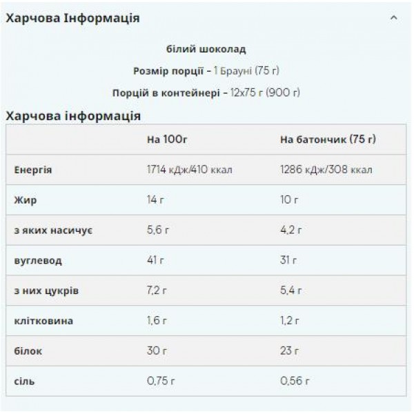 Сделанное с лучшим какао с добавлением крошки из шоколада премиального качества, наш протеиновый брауни представляет собой наше самое последнее пополнение в линейке наших высокобелковых закусок. Вы не сможете устоять перед его ""шоколадностью"" и тем, как оно приятно жуется! Невозможно поверить, но факт - в каждом брауни содержится 23 гр протеина и только 4 гр сахара. Эта тающая во рту выпечка содержит на 75 с лишним процентов меньше сахара, чем обычные пирожные из супермаркета, так чего же вы ждете? Решайтесь, вы можете позволить себе эту вкусняшку, не чувствуя вины за то, что объелись сладким! Чтобы действительно получить удовольствие, почему бы не попробовать одно из наших пирожных с нашими десертными сиропами без сахара - MySyrupTM, и нашей замечательной арахисовой пастой. Высокое содержание белка в протеиновом брауни будет способствовать росту и поддержанию сухой мышечной массы. Порция - 1 Пирожное (75g) Nutritional Information В 100 гр В 75 гр Energie 1600 кДж/383 ккалl 1200 кДж/287 ккал Grasimi 13 гр 9.7 из которых насыыщенных 5.7 гр 4.2 гр Углеводы 35 гр 27 гр из которых сахара 5.3 гр 4 гр Клетчатка 2.7 гр 2 гр Протеин 30 гр 23 гр Соль 0.4 гр 0.3 гр