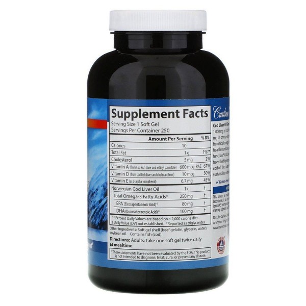 Рыбий жир из печени трески Carlson Labs (Cod liver oil) 1000 мг 250 капсул