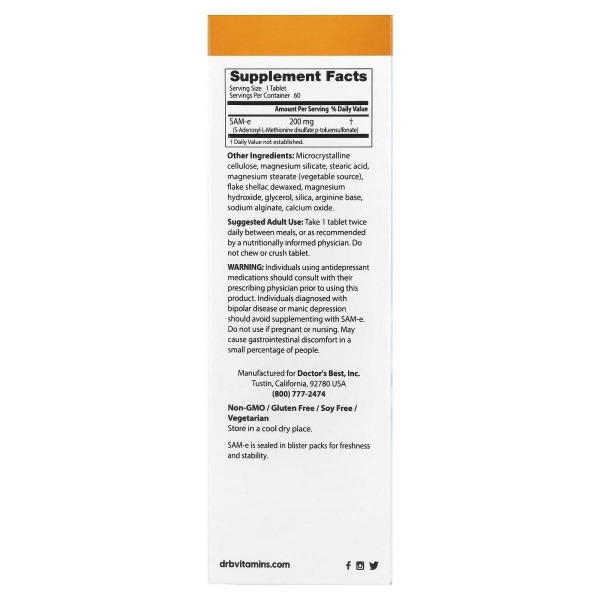 S-аденозилметионин 200, SAM-e 200, Doctor's Best, 200 мг, 60 таблеток с кишечнорастворимой оболочкой