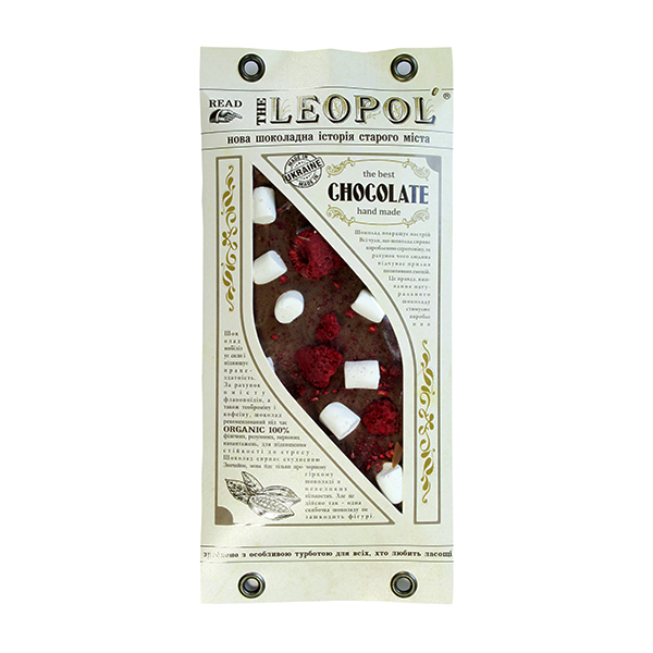 Это шоколад ручной работы, который выдается лишь в Львове с 2017 года. Он сделан из особой заботой о всех, кто любит сладости. Молочный шоколад "Leopol" с малиной и маршмелоу имеет изысканный вкус для ценителей качества настоящего, натурального продукта. Состав: сахар, масло какао, сухое цельное молоко, сыворотка(из молока), лактоза и молочные белки, целлюлоза фундука, молочный жир, эмульгатор, (соевый лецитин), ароматизатор, какао тертое, менее 30%, масса молока минимум 15%, маршмелоу, сублимированная малина. Вес 95 г. 2016 кДж/ 530 ккал.