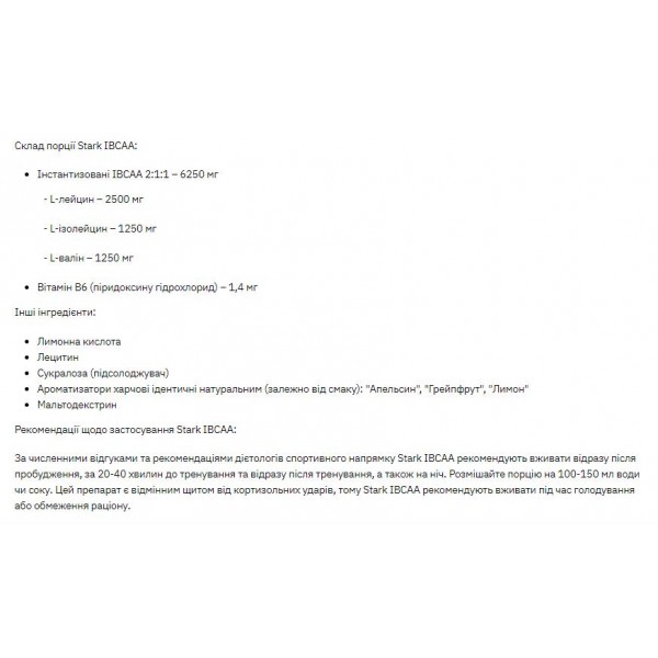 Это инстантизированная форма незаменимых аминокислот с отличным вкусом. Именно инстантизированная, то есть хорошо растворимая в воде форма, усваивается организмом намного быстрее и в полной мере. Stark IBCAA – это сочетание незаменимых аминокислот L-формы, которые в значительной степени синергетически усиливают действия друг друга. Как известно, лейцин, изолейцин и валин питают 35% всех мышечных тканей, что на порядок ускоряет процесс набора сухой мышечной массы. Помимо ярко выраженного анаболического эффекта, Stark IBCAA является неотъемлемой добавкой для подпитки мышечных клеток в качестве топлива. Именно ВСАА питают энергией миофибриллы во время тяжелых тренировок. Стоить отметить, что данный препарат поддерживает постоянный азотистый баланс в организме атлета, тем самым поддерживая процессы метаболизма на высоком уровне, и обладает антикатаболическим эффектом, доставляя в мускулатуру полезные питательные вещества, которые так необходимым для построения мышечных волокон атлета. Кому рекомендуется принимать Stark IBCAA: Каким бы силовым видом спорта не занимался спортсмен, мышечная ткань подвергнута рубцеванию и микротравмам. В связи с постоянным прогрессом и увеличением анаэробных нагрузок на организм, мышечным волокнам необходимо больше ресурсов для восстановления. Атлеты, которые подвергают организм аэробным нагрузкам, и целью которых является увеличение скоростно-силовых показателей без повышения веса собственного тела. Людям, которые ведут активный образ жизни и при этом посещают тренажерный зал. Следует учесть, что возраст и пол такого атлета значения не имеют. При использовании низкокалорийных диет необходимо принимать ВСАА. При недостатке калорий организм в первую очередь начинает поглощать аминокислоты из мышц, суставов и хрящей, а это ведет к атрофии и только потом уничтожается жир. Во избежание атрофии и для целевого сжигания жира необходимо питать свои мышцы аминокислотами. Действие Stark IBCAA: Сжигание подкожного жира; Прирост сухой мышечной массы; Поддержание азотистого баланса; Ускоренный синтез белка в мышцах; Антикатаболические действия; Насыщение мышечных волокон энергией. Stark IBCAA – это лучшая добавка из представленных на рынке спортивного питания. Положительные отзывы атлетов профессионального уровня, а также новичков железного спорта подтверждаются визуальным результатом. Обратите внимание, что данный препарат не является гормональным (нестероидным) и полученный прогресс от применения Stark IBCAA останется с Вами на долгое время. Возобновив тренировки, Вы вновь сможете добиться ранее достигнутых результатов. Состав порции Stark IBCAA: Инстантизированные IBCAA 2:1:1 – 6250 мг L-лейцин - 2500 мг L-изолейцин - 1250 мг L-валин - 1250 мг B6 (пиридоксина гидрохлорид) - 1,4 мг Другие ингредиенты: Лимонная кислота, кислота яблочная, глицин, подсластители (E952, E955), ароматизатор пищевой идентичный натуральному (в зависимости от вкуса): "Апельсин", "Ананас", "Лимон", "Клубника", "Черная смородина", мальтодекстрин, гидротартрат калия, хлорид натрия. Рекомендации по применению Stark IBCAA: По многочисленным отзывам и рекомендациям диетологов спортивного направления Stark IBCAA рекомендуют употреблять сразу после пробуждения, за 20-40 минут до тренировки и сразу после тренировки, а также на ночь. Размешайте порцию на 100-150 мл воды или сока. Данный препарат 