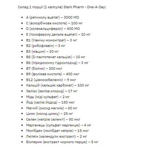 Обратите внимание, что Витаминно-минеральный комплекс, Stark One - a - Day - 60tabs не является лекарственным средством. Не заменяет полноценное питание. Не превышайте рекомендуемую суточную дозу. Используйте согласно инструкции изготовителя, которая находится на упаковке или внутри нее.