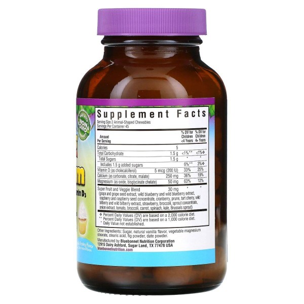 Продукт Super Earth Rainforest Animalz Calcium Magnesium & Vitamin D3 от Bluebonnet содержит: