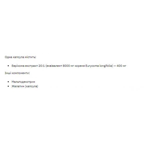 ???? Повышенная выносливость: экстракт эврикомы способствует повышению уровня энергии и выносливости, что помогает вам чувствовать себя более активными и эффективными в повседневной жизни.