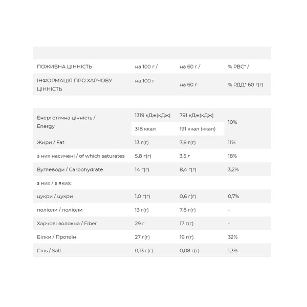 Состав: смесь растительных белков 27% (изолят соевого белка, изолят горохового белка, концентрат рисового белка), пищевые волокна (изомальтоолигосахариды, растворимая кукурузная клетчатка), глазурь с подсластителями 17% (пищевые волокна [мальтит, стевиол-гликозиды из стевии], какао-порошок, эмульгатор: соевый лецитин, натуральный ароматизатор), кокосовое масло, подсластители (мальтит, стевиол-гликозиды из стевии), малиново-карамельный слой 16% (харч яблочное пюре, подсластитель: мальтит, концентрат малинового сока 1%, кукурузный крахмал, регулятор кислотности: лимонная кислота, натуральный ароматизатор), фисташки 3%, увлажнитель: растительный глицерин, эмульгатор: соевый лецитин, натуральный ароматизатор, натуральный ароматизатор; морская соль, антиоксидант: витамин Е (токоферола ацетат). Может содержать следы арахиса, молока.