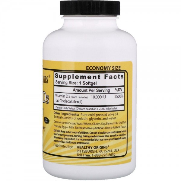 Витамин Д3, Vitamin D3, Healthy Origins, 10000 МЕ, 360 желатиновых капсул