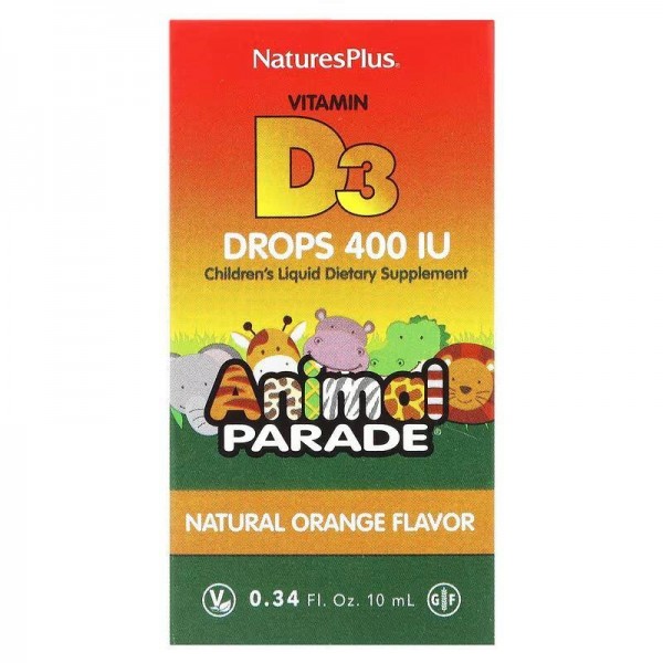 Витамин Д3 в каплях (Vitamin D3 drops) - изготовлен специально для детей и младенцев. Он не содержит алкоголя, содержит только натуральные ингредиенты, максимально усваивается организмом и имеет апельсиновый вкус. Специально разработанный для детей и может быть прекрасным дополнением к Animal Parade жевательных мультивитаминов.