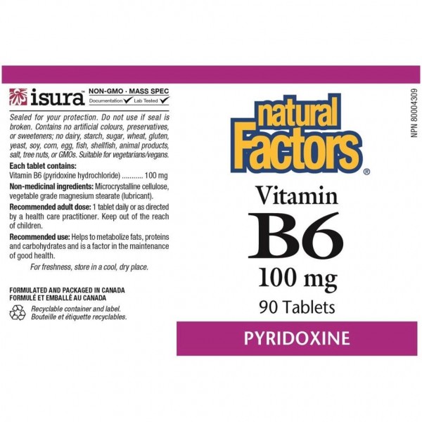 Витамин Vitamin B6, Pyridoxine HCl, 100 mg, 90 Tablets Natural Factors