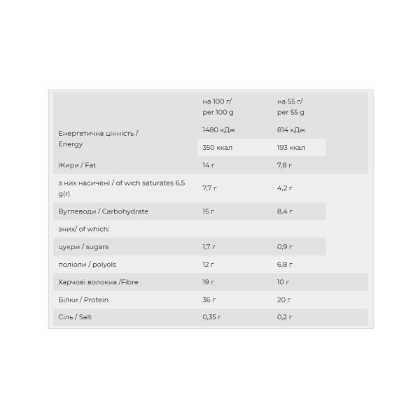 Состав: смесь молочных белков (концентрат сывороточного белка, концентрат молочного белка, изолят сывороточного белка) 36,6%, шоколад молочный (масло кокосовое, полидекстроза, сыворотка молочная сухая, подсластители (мальтитол, стевиол гликозиды из стевие), молоко содержанием жира, эмульгатор - соевый лецетин, натуральный ароматизатор, соль морская) 21%, гидролизат коллагена, пищевые волокна (полидэкстроза, изомальтоолигосахариды), масло кокосовое, подсластитель - мальтитол, влагоудерживающий агент - глицерин, соевый лецетин, регулятор кислотности – кислота лимонная, соль морская, антиоксидант – витамин Е (токоферола ацетат), краситель натуральный – сок черной моркови (антоцианы). Может содержать следы орехов, сои, яиц.