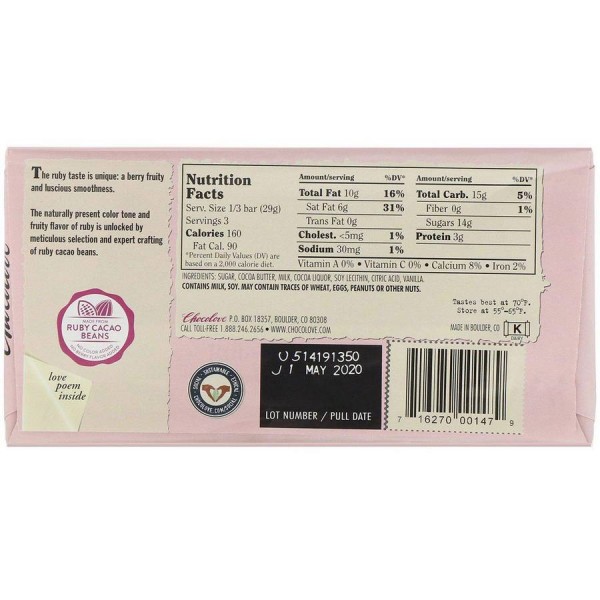 - Виготовлено з рубінових какао-бобів, без доданих барвників і ягідних ароматизаторів