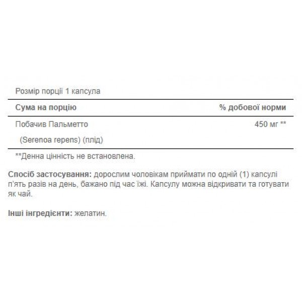 - Кожна капсула містить 450 мг екстракту Saw Palmetto