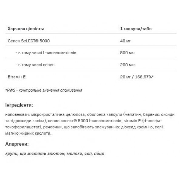 Склад: Продукт містить високоякісний селен у формі селенометіоніну, що забезпечує ефективне засвоєння цього важливого мікроелемента.