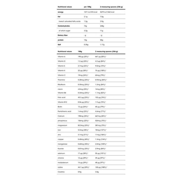 одна порція містить 50 г білків, з швидкої і повільної абсорбцією