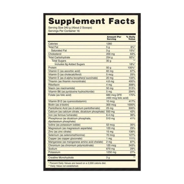 Serious Mass це якісний гейнер для побудови м'язової маси, її обсягу і сили. Кожна порція Serious Mass містить 1260 калорій, 250 г комплексних вуглеводів, 50 г якісних білків - сироватковий протеїновий концентрат, казеїнат кальцію і яєчний альбумін. Продукт також збагачений глютаміном, креатином, інозитол і комплексом 25 вітамінів і мінералів.