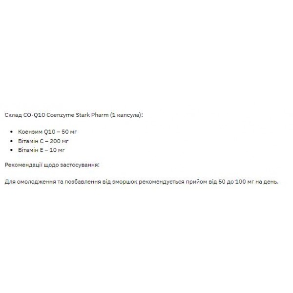 ????Рекомендований спосіб вживання: рекомендується приймати по 1 капсулі Stark CO-Q10 Coenzyme 50mg щодня під час їжі.