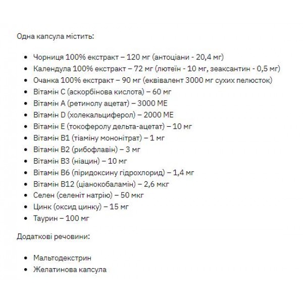 Кожна капсула Stark Eyes Care Complex містить натуральні інгредієнти, які можуть сприяти здоров'ю очей та покращити їх функціональність. Цей продукт може бути особливо корисним для тих, хто часто відчуває сухість очей, роздратування або втому.