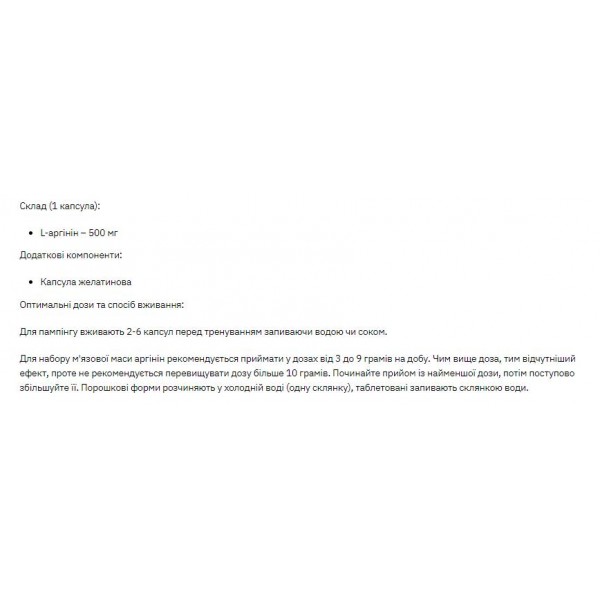 Аргінін у капсульованій формі спортивний анаболічний препарат для підтримки позитивного азотистого балансу та зміцнення серцево-судинної системи. Заявлені ефекти аргініну: є донатором оксиду азоту; покращує харчування м'язів; прискорює відновлення; прискорює загоєння травм; знижує артеріальний тиск; покращує еректильну функцію; покращує транспорт креатину у м'язи; сприяє пампінгу; антиоксидантні властивості; посилює секрецію гормону росту; знижує шкідливий холестерин; зміцнює імунітет. Склад (1 капс.): L-аргінін 500 мг Додаткові компоненти: Капсула желатинова. Оптимальні дози та спосіб вживання: Для пампінгу вживають 2-6 капсул перед тренуванням запиваючи водою чи соком. Для набору м'язової маси аргінін рекомендується приймати у дозах від 3 до 9 г на добу. Чим вище доза, тим відчутніший ефект, проте не рекомендується перевищувати дозу більше 10 грам. Починайте прийом із найменшої дози, потім поступово збільшуйте її. Порошкові форми розчиняють у холодній воді (одна склянка), таблетовані запивають склянкою води.