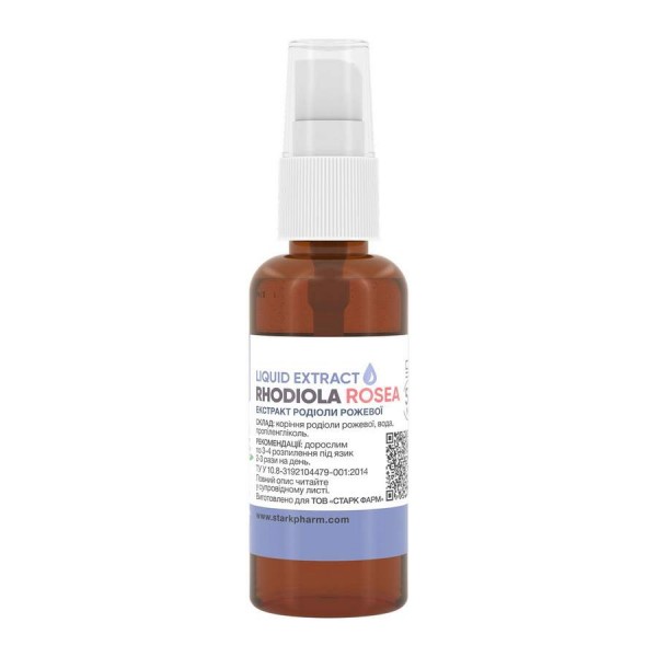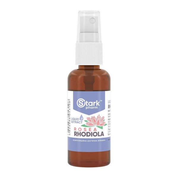 Харчова добавка Stark Pharm - Stark Rhodiola Liquid Extract містить екстракт коріння родіоли рожевої у формі спрею. Користь родіоли рожевої (відома як золотий корінь або королівський корінь) зумовлена її потужними адаптогенними властивостями, які забезпечують позитивний вплив на здатність організму протистояти різним стресовим факторам, серед яких психологічні, фізичні, інфекційні, хімічні, фактори старіння, фактори новоутворень (ракових) та інші.