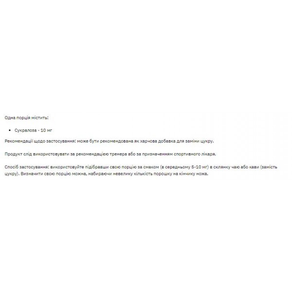 ????Рекомендований спосіб вживання: викоримтовуйте Stark Sucralose за смаком в невеликих кількостях. Оскільки цей продукт дуже концентрований, вам може знадобитися менше, ніж звичайного цукру, щоб додати солодкість до ваших страв або напоїв.