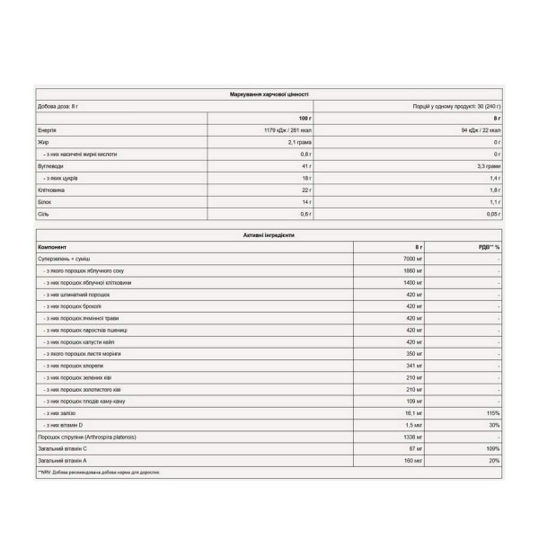 Склад : суміш порошків SuperGreens+ (порошок яблучного соку, порошок яблучної клітковини, порошок шпинату, порошок броколі, порошок спіруліни [Arthrospira platensis], порошок ячмінної трави, порошок пшеничної трави, порошок капусти кейл, порошок листя морінги [Moringa oleifera], порошок хлорели [Chlorella pyrenoidosa, Chlorella vulgaris], стандартизований порошок зелених ківі, порошок золотих ківі, порошок плодів каму каму [Myrciaria dubia], холекальциферол), порошок спіруліни (Arthrospira platensis) , L-аскорбінова кислота, ретинілацетат.