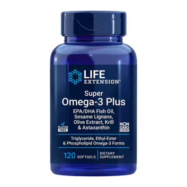 Life Extension Super Omega-3 Plus – це комплексна харчова добавка, яка підтримує загальне самопочуття та здоров'я. Кожна м'яка капсула містить високоякісний риб'ячий жир з EPA і DHA, доповнений сезамовими лігнанами, екстрактом оливок, крилем і астаксантином.